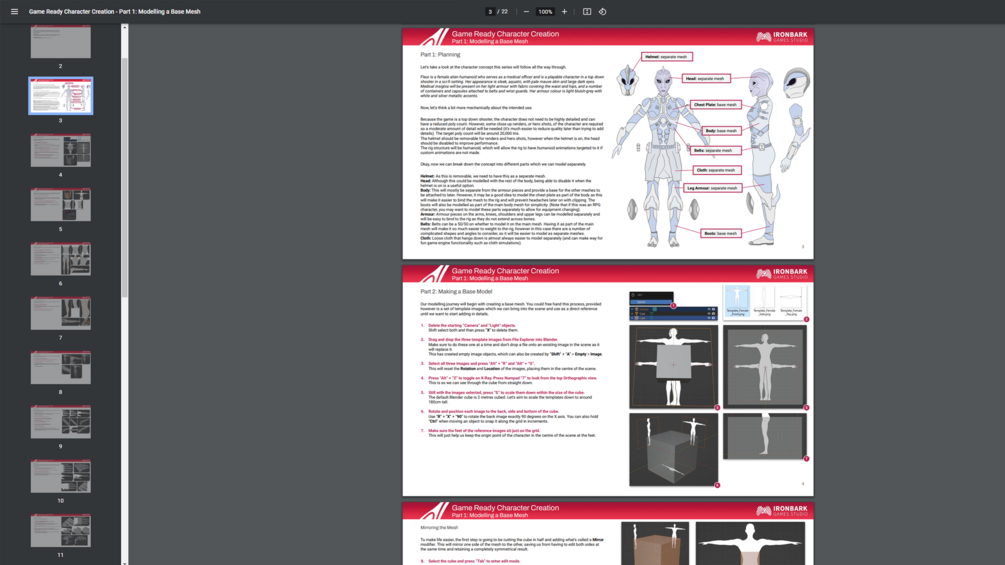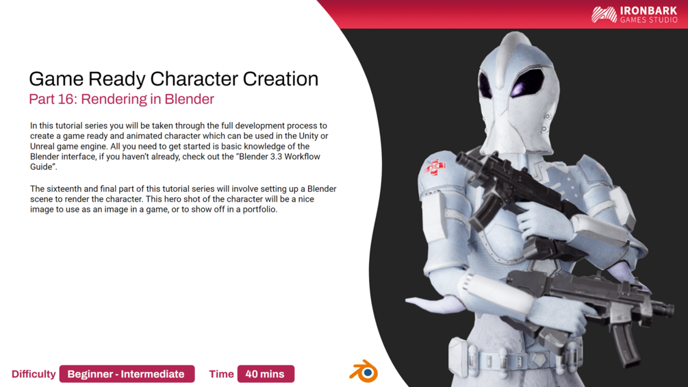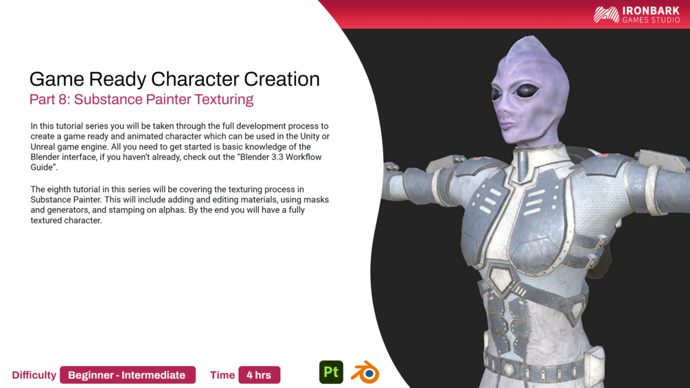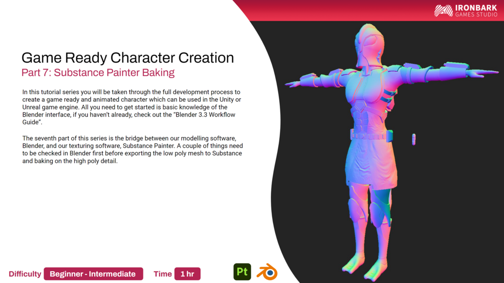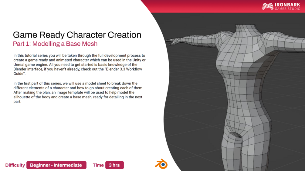 In this tutorial series you will be taken through the full development process to create a game ready and animated character which can be used in the Unity or Unreal game engine. Using Blender you will model, sculpt, retopo and UV map your character before bringing it into Substance Painter to texture. Then back in Blender you will create a rig for your character, bind it and create some basic animations such as a walk cycle before exporting the completed character to your game engine of choice. All you need to get started is basic knowledge of the Blender interface, if you haven’t already, check out the Blender 3.3 Workflow Guide: https://ironbarkgames.gumroad.com/l/blender-beginner-series